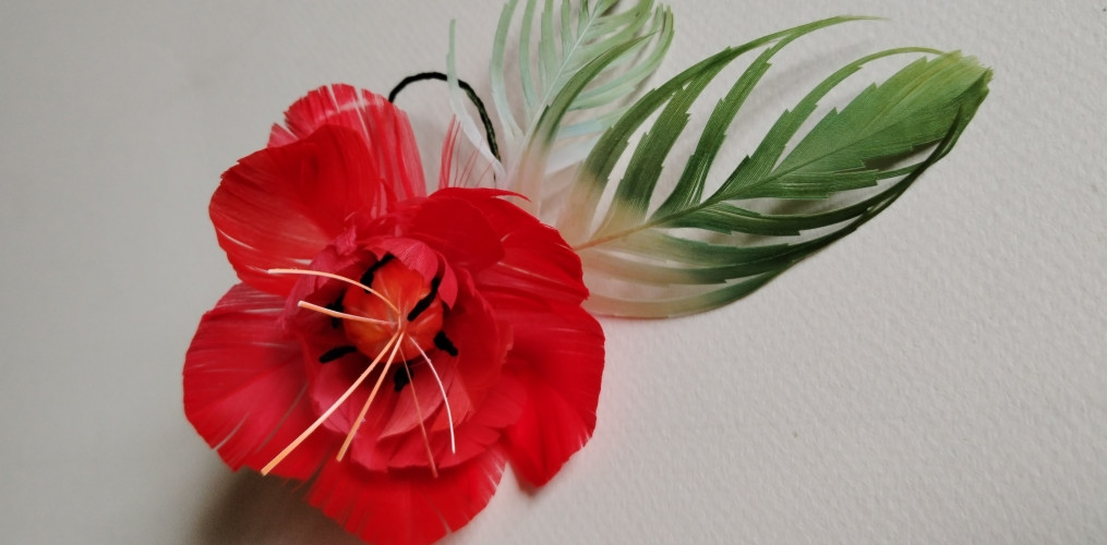 Réalisation d’une fleur en plumes, pouvant être déclinée en bijou de cheveux (bijou de tête) ou en élément décoratif monté sur tige de laiton.