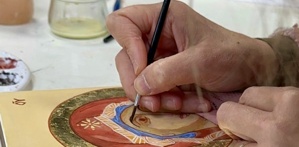Travail de posture, dessin au pinceau, peinture sur planche vous permettront de dessiner les traits du visage de la Vierge et ainsi de réaliser une icône très simple.