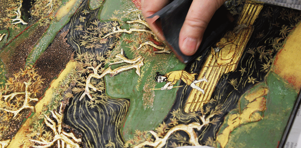 Vous apprendrez également les bases de la composition à partir de motifs que vous pourrez décalquer, reproduire ou modifier selon votre inspiration. Un panneau préparé vous sera fourni en début de stage. Vous repartirez à la fin de la semaine avec votre création personnelle, en souhaitant que cette initiation vous donne envie de plonger encore davantage dans le merveilleux univers de la laque.